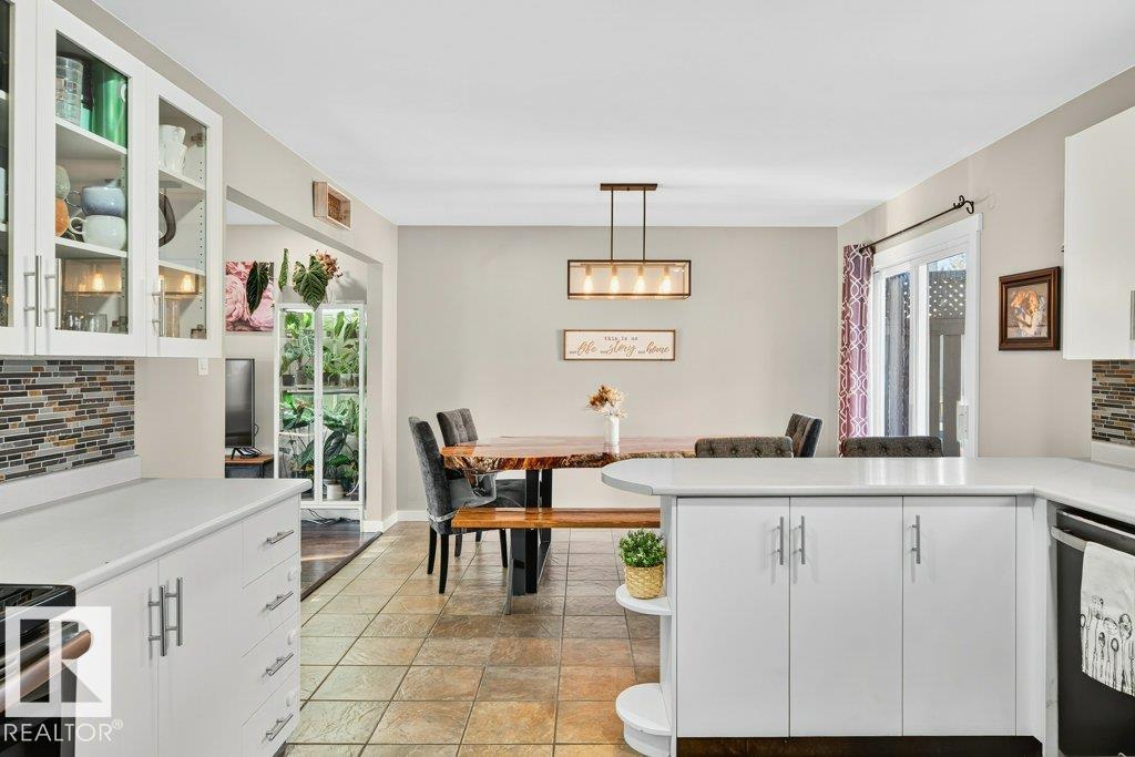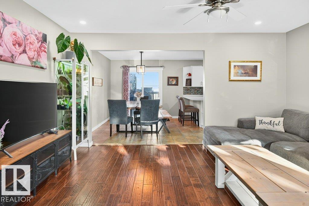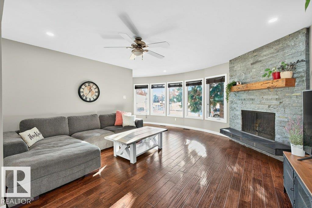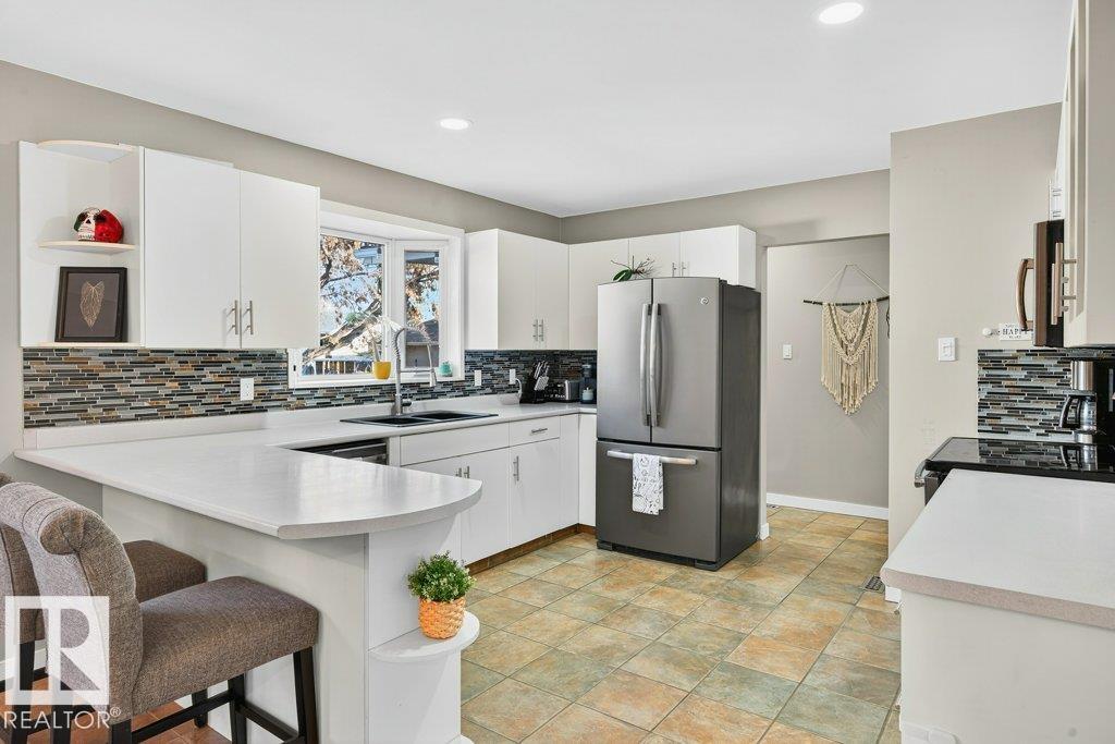The kind of home families wait for--warm, updated, and close to schools in the heart of Callingwood. A fully finished, 1305 Sq Ft bungalow welcomes you with an open main floor, engineered wood plank flooring, pot lights, and updated vinyl windows. A sun-filled bay window frames the rustic stone-faced wood fireplace, creating the perfect cozy hub for everyday living. Modern kitchen is designed for real life with S/S appliances, ample storage, and space to gather. Generous bedrooms include a primary with its own 2-piece ensuite, plus a beautifully updated 4-piece bath with durable concrete counters. Downstairs offers a large rec room with WET BAR and mini fridge, a 3-piece bath, extra bedroom, and flexible space for work or play. Outside, enjoy a PRIVATE fenced yard, large deck with hot tub, and an OVERSIZED insulated double garage with new opener. New A/C, furnace (2019) screened eaves, spray foam insulation, and permanent GOVEE LIGHTS! Easy access to transit, YMCA, Twin Arenas, the Whitemud and Henday! MLS®: E4475124 - Callingwood North Bungalow $483,900