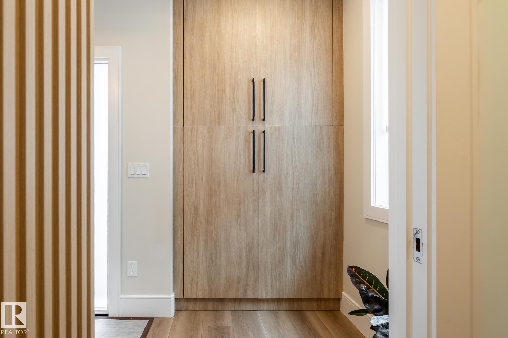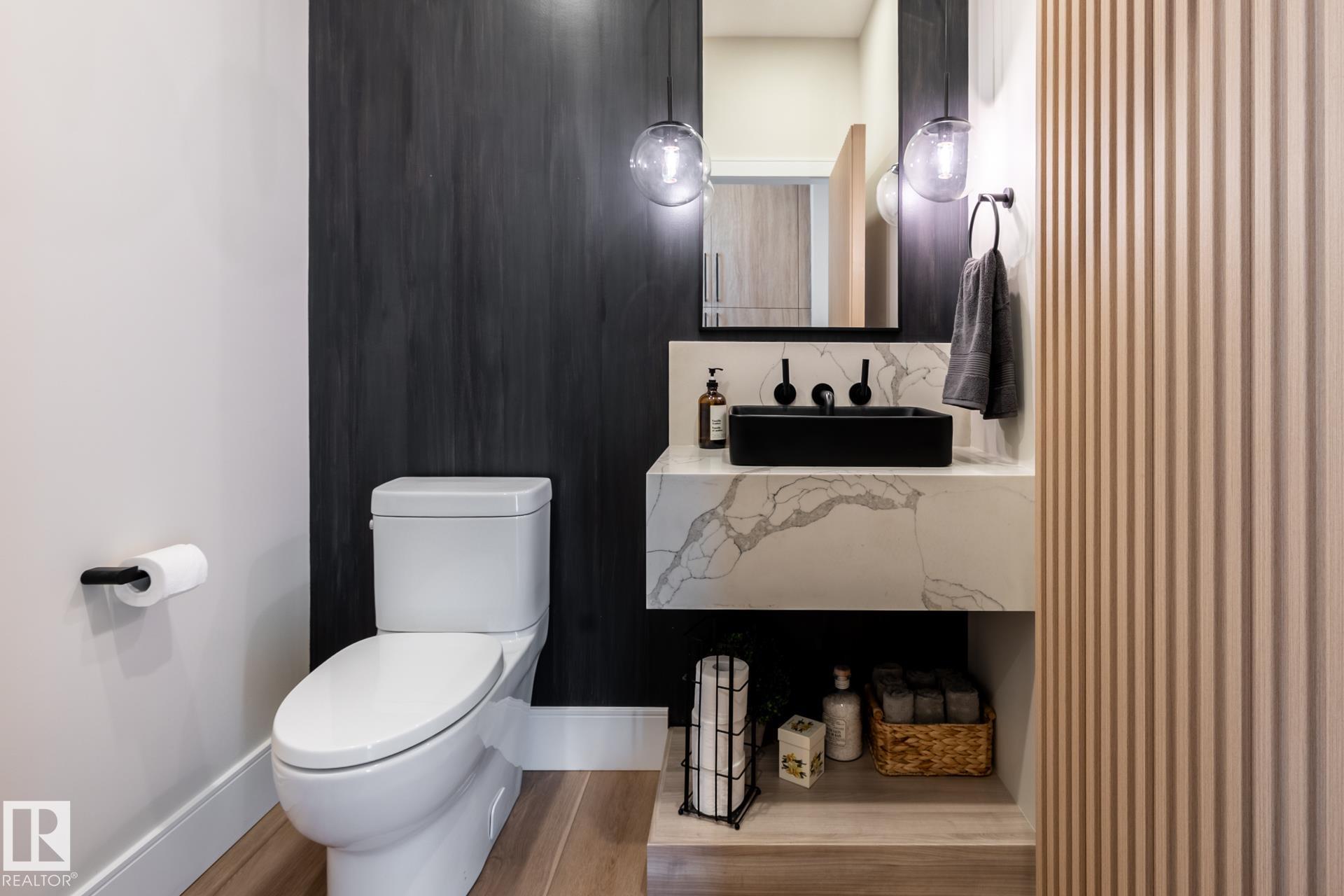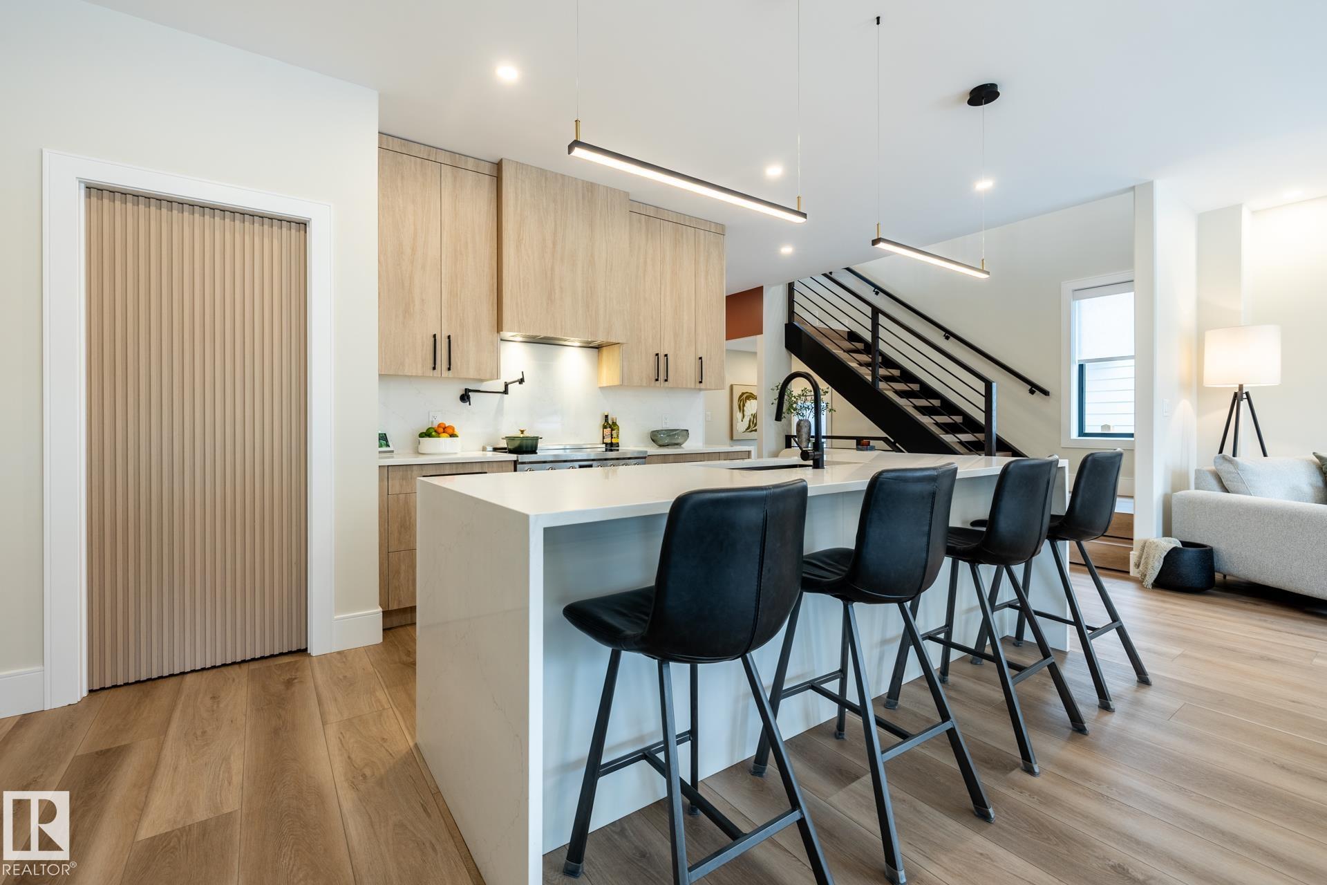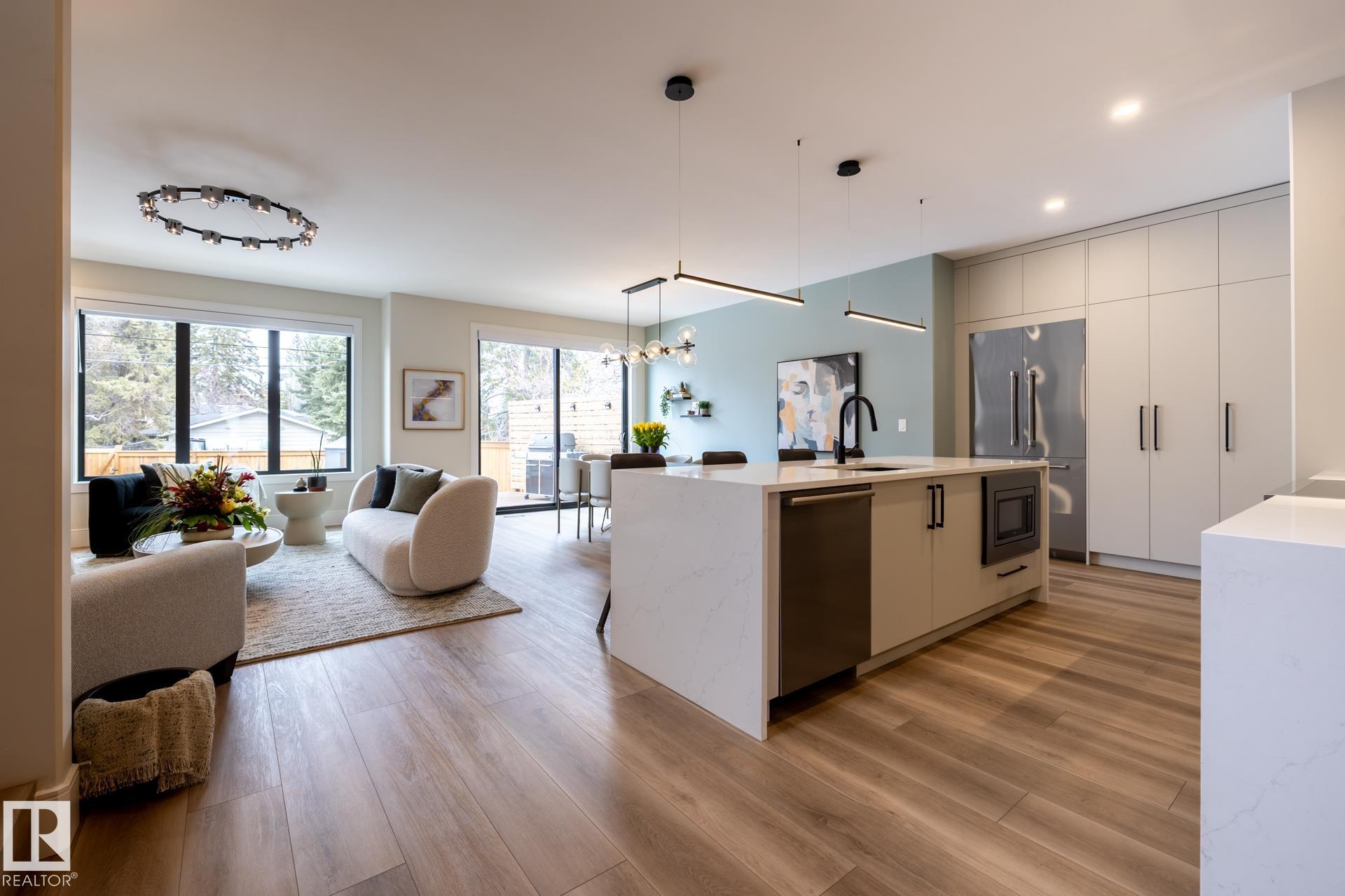 This full-width Crestwood home on a deep pie-shaped lot is set behind a green space, offering additional front parking and enhanced curb appeal. Hardie board, wood, and concrete exterior delivers a commanding presence, distinct from standard stucco infill. Inside, over 3,300 sq ft of intentionally designed living space. Curated with fluted wood doors, an open stairwell with wood treads and steel railing, and a full stone gas fireplace anchoring the main living space. The kitchen features a waterfall island, full-height cabinetry, pot filler, and a walk-in pantry with storage, prep space, and wine fridge. 4 bedrooms, 3.5 baths, plus a true second-floor bonus room. Upper-level laundry with cabinetry and sink. The primary suite sets the standard with a freestanding tub, tiled shower, and oversized walk-in closet. Fully finished basement with high ceilings. Double attached garage. Premium landscaping, composite deck, A/C, and window coverings complete. A level rarely delivered in new construction. MLS®: E4481226 - Crestwood 2 Storey $1,274,500