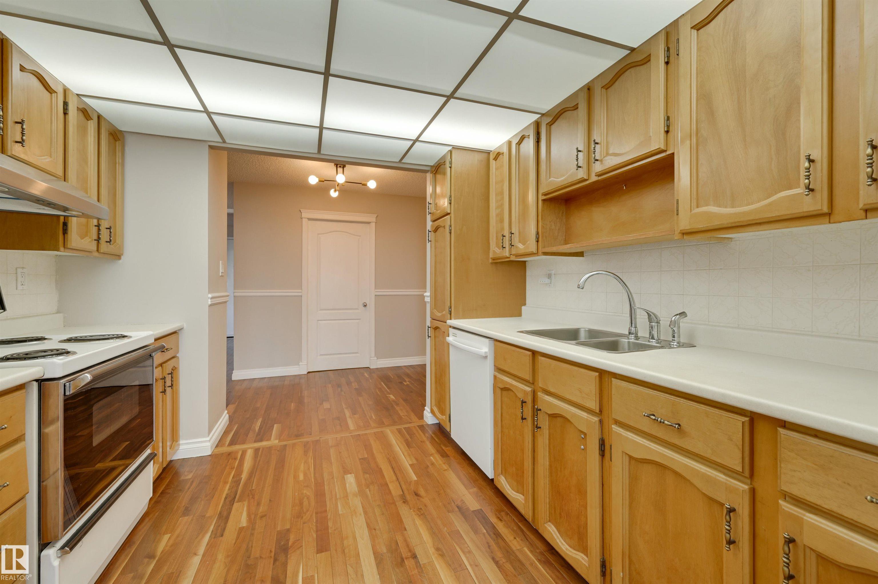 Spacious 2 bedroom, 2 bathroom condo (1,422 sq.ft.) in McDougall Place, ideally located near LRT, Ice District, restaurants, coffee shops, river valley trails, and with quick access to the U of A. Situated on the south side of 104 Street--close to the action yet on a quiet tree-lined street. Bright east and south exposures with a south-facing balcony offering partial river valley views. Features walnut hardwood and ceramic tile, a formal dining room plus kitchen eating area, and 2 large in-suite storage rooms. Includes 4-piece main bath and 3-piece ensuite. Appliances: stove, fridge, dishwasher, in-suite washer/dryer, and air conditioning. Titled underground parking stall (#120) included. Condo fees cover heat, water, power, building insurance, plus access to exercise room, social room, and visitor parking. A great value in an excellent location ready for immediate possession! MLS®: E4455343 - Downtown (Edmonton) Single Level Apartment $249,900