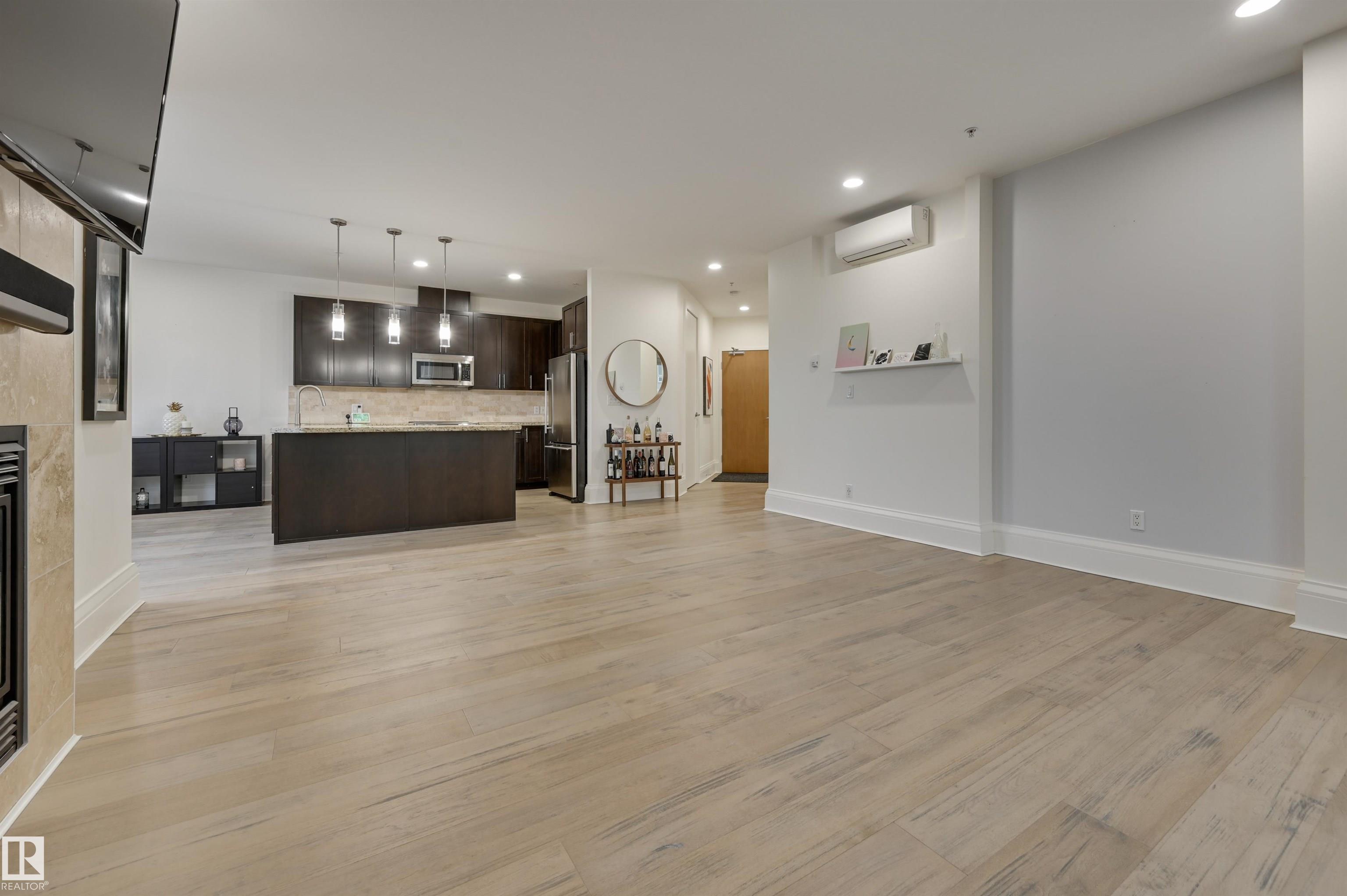 Experience elevated living in this luxurious 1,286 sq.ft. sub-penthouse. This impressive 2-bed, 2-bath residence is one of only three units on the 28th floor. The condo comes with two underground parking stalls (tandem) and a large storage cage. Perfect for entertaining is the expansive upgraded living area, highlighted by wide-plank hardwood floors, air conditioning, two balconies, and a cozy gas fireplace. The open kitchen showcases granite countertops, upgraded stainless steel appliances, and breakfast bar. Spacious primary bedroom with it's own balcony and walk in custom closet while the ensuite adds a steam shower and Japanese bidet toilet for spa-level comfort. Smart home features elevate convenience with LED pot lights, a video doorbell, upgraded fixtures, and integrated controls for lighting, music, and more. All of this in an unbeatable 104 St. location--steps to the outdoor farmers market, Ice District, top restaurants, and cafes. Move-in ready and designed to impress! MLS®: E4475997 - Downtown (Edmonton) Single Level Apartment $524,900