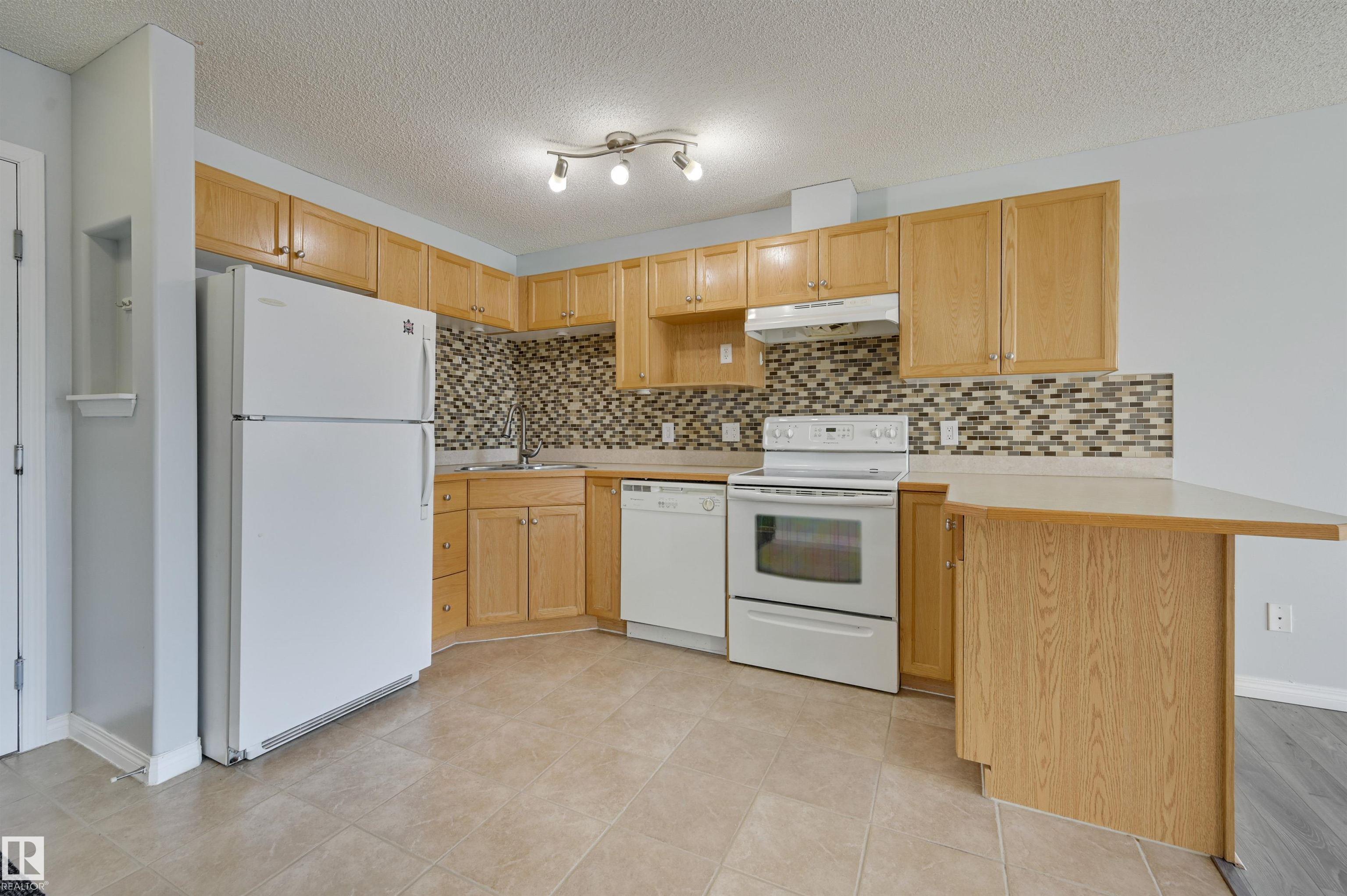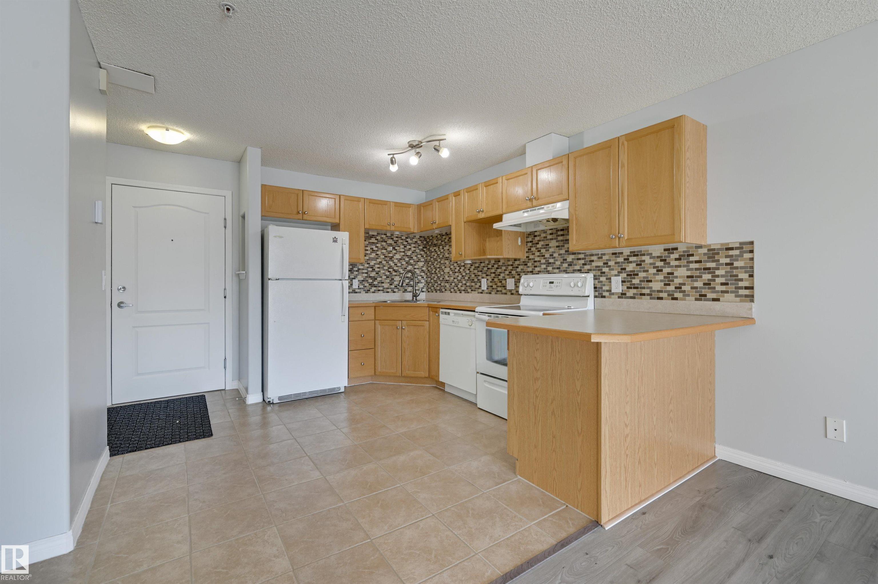 Welcome to this bright upgraded one bedroom condo in Park Place at Eaux Claires! Close to all amenities and easy access to the Anthony Henday. This suite is SW facing providing direct sunlight all day long with nice updates including flooring, paint, ceiling fan, and tile kitchen backsplash. There is a spacious living and dining area with laminate floors. Functional U-shaped kitchen with breakfast bar, oak cabinetry, and tile floors. The primary bedroom has plush upgraded carpets and modern ceiling fan. Main bathroom next to the bedroom complete with tub/shower. In suite laundry and there is a good sized in suite storage room. This suite comes with a titled parking stall. Very reasonable $372.39/mth condo fee which covers heat and water utilities. A fresh, bright, and move in ready home with at an affordable price point! Conveniently located right next to a major shopping district and Eaux Claires public transportation hub. MLS®: E4474509 - Eaux Claires Single Level Apartment $136,900