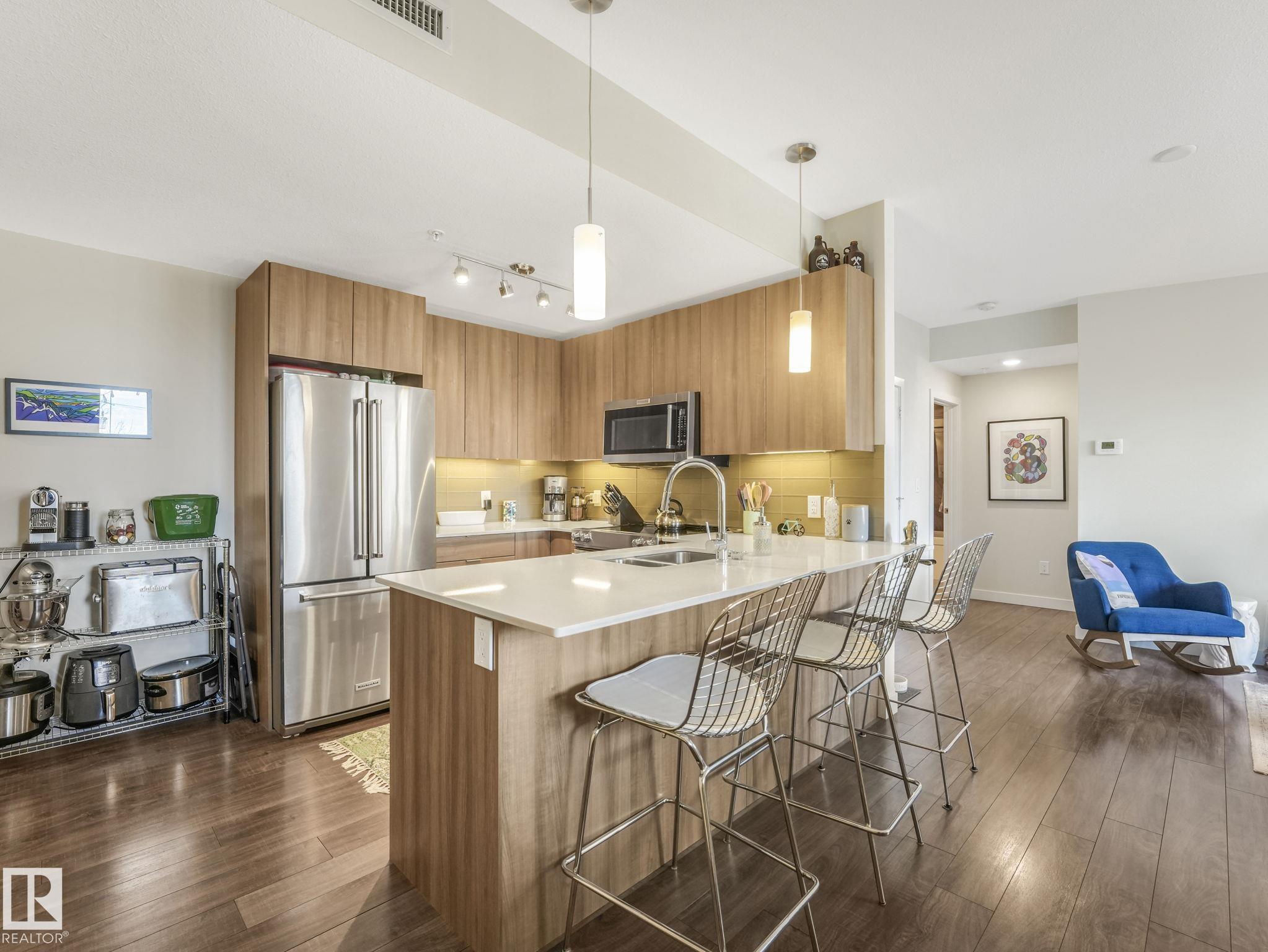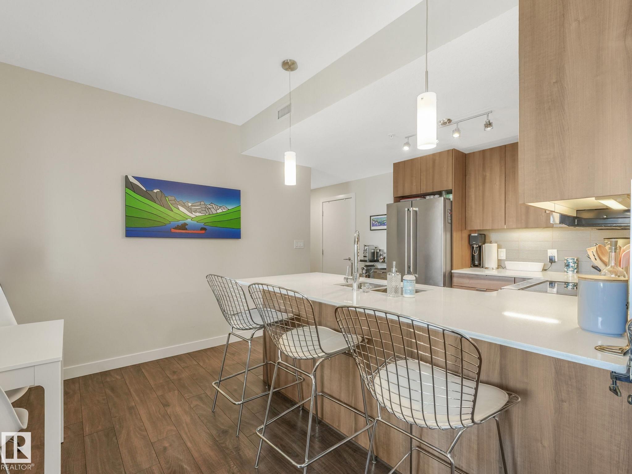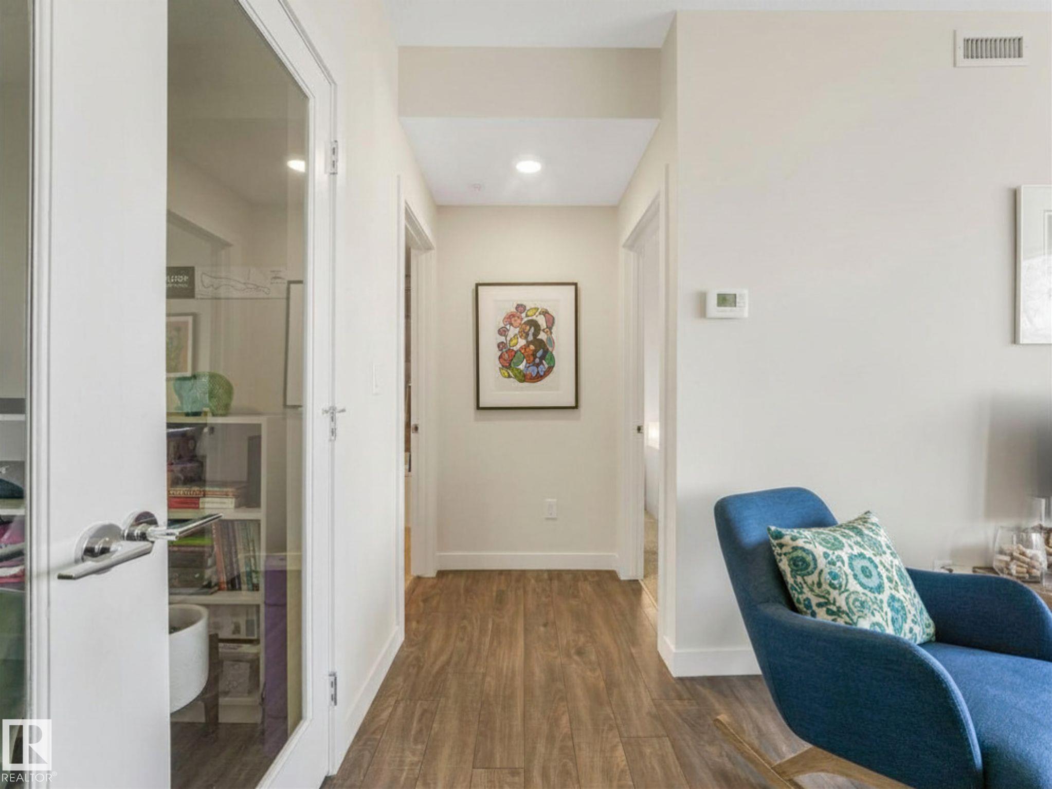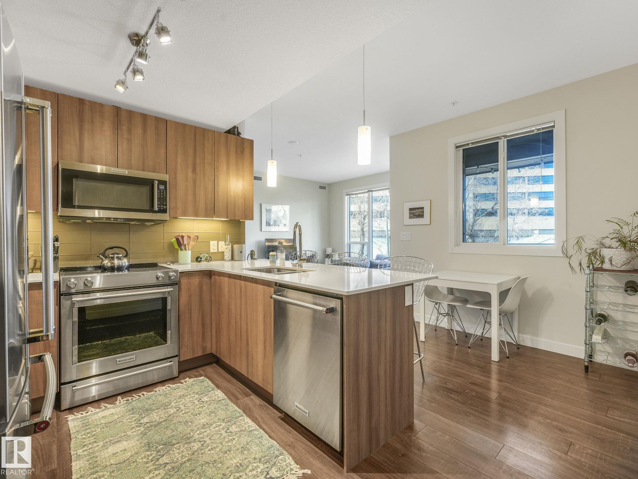 Welcome to Studio On The Hill! Step out your door into the vibrant energy of Whyte Ave and Old Strathcona. Enjoy top-tier dining, trendy cafes, and scenic River Valley trails all just steps away. This spacious air conditioned 690 sq. ft. 1-bed + den condo offers a versatile layout perfectly tailored for today's dynamic lifestyle. Work From Home? The flexible den is the ultimate home office, guest space, or extra storage. The open concept is complemented by the warm tones of the modern kitchen featuring stainless steel appliances, quartz countertops, under cabinet lighting and a peninsula island. Retreat to the primary bedroom, complete with a walk-in closet and custom shelving. Say goodbye to winter mornings scraping ice with your highly-coveted, oversized heated parking stall! Located in a well-managed building, this home is ideal for first-time buyers or young professionals seeking a low-maintenance, walkable lifestyle. Live, work, and play in one of the city's best communities! MLS®: E4482036 - Strathcona Single Level Apartment $259,000
