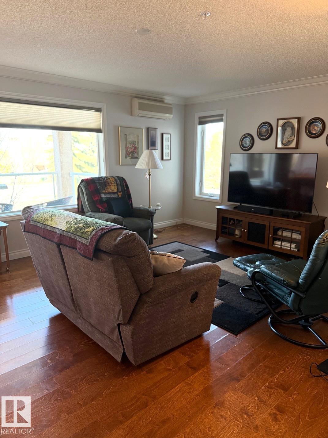 Welcome to this well maintained 55+ adult living building! This bright and spacious unit features gleaming hardwood floors, crown moulding and a functional layout. The l... MLS®: E4483078 - Durham Town Square Single Level Apartment $389,900